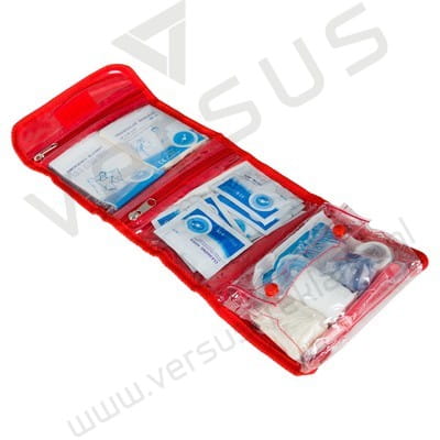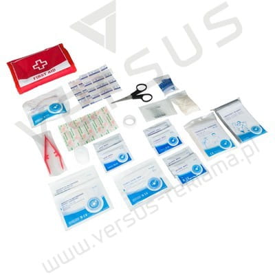 Apteczka w pokrowcu na rzep, posiada 2 przezroczyste kieszenie na zamek i przezroczystą kieszeń na zatrzask, wewnątrz: bandaż trójkątny, bandaż elastyczny, taśma, 6 agrafek, nożyczki, 4 mokre chusteczki, 4 płatki nasączone alkoholem, para rękawiczek ochronnych, szczypce, gaza, waciki, 2 opatrunki, 9 plastrów, maska do resuscytacji oraz koc ratunkowy