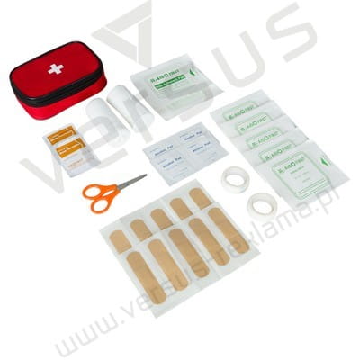 Apteczka w pokrowcu z mocowaniem do paska, główna przegroda na zamek błyskawiczny, wewnątrz: 10 plastrów, 4 płatki nasączone alkoholem, 2 taśmy, 2 nieprzylegające opatrunki, 2 bandaże, 2 waciki, 2 chusteczki nasączone mydłem oraz nożyczki