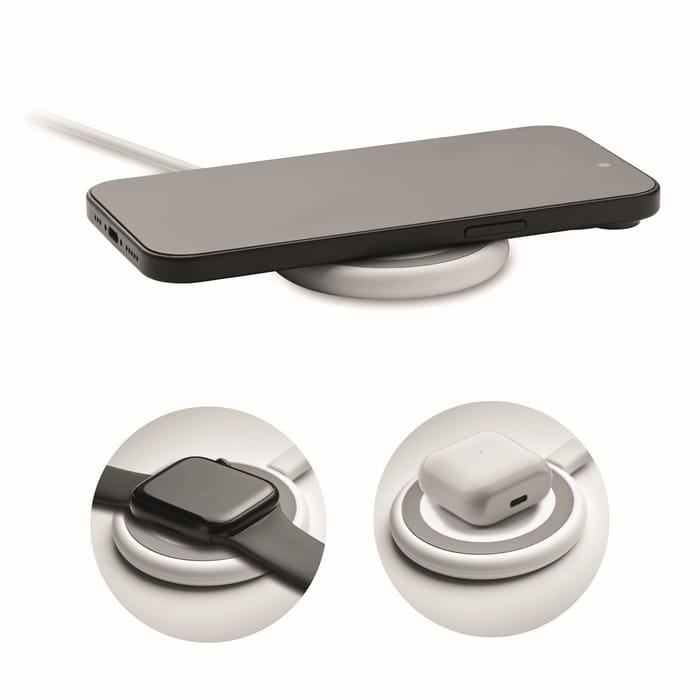 Bezprzewodowa ładowarka 3 w 1 o mocy 15 W. Zawiera magnetyczną ładowarkę bezprzewodową 15 W, ładowarkę do smartwatcha (tylko Apple®) i ładowarkę TWS. Długość kabla: 1M. Wejście: 2 w 1 Type-C i Type-A.