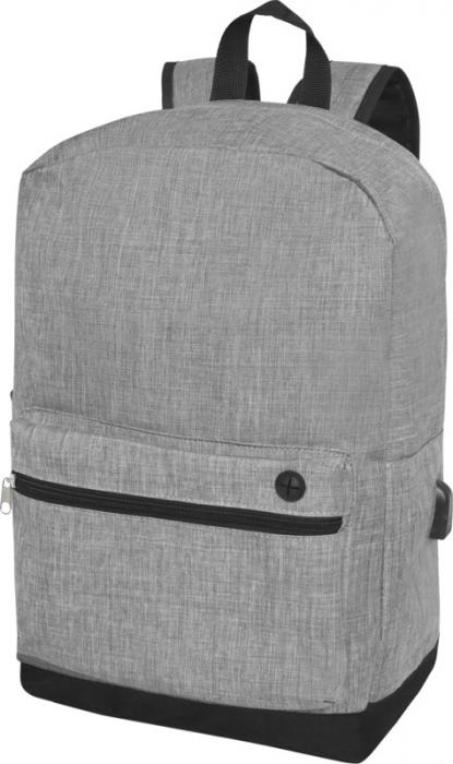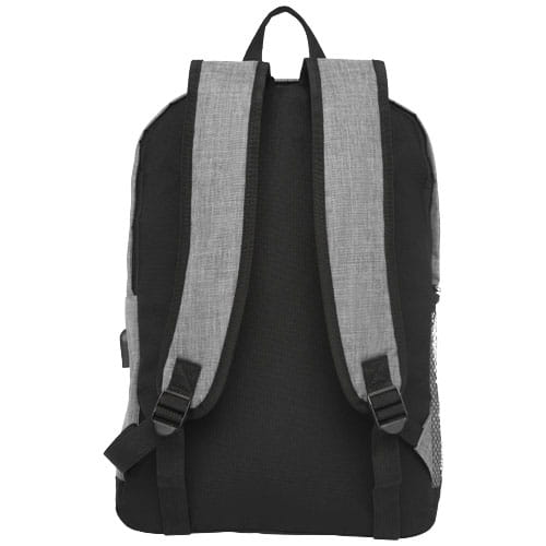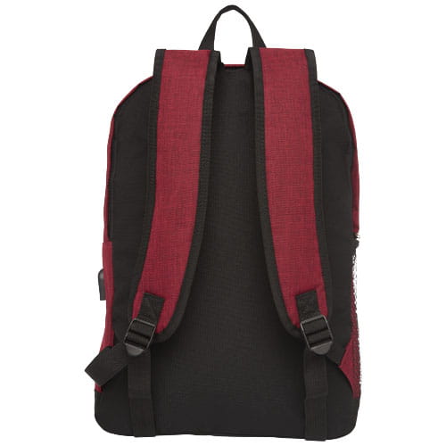 Plecak na laptopa z przednim panelem w kolorze melanżowym oraz tylnym panelem i dolną częścią w kolorze czarnym. Posiada dużą główną komorę zamykaną na zamek błyskawiczny z wyściełaną kieszenią na 15,6 cala laptopa i przednią komorę zamykaną na zamek błyskawiczny, umożliwiającą szybki dostęp do urządzeń przenośnych. Jest wyposażony w port USB, w tym kabel USB-A z 1 złączem męskim i 1 żeńskim. Wygodne wyściełane paski na ramię, uchwyt do transportu i siatkowa kieszeń na butelkę z wodą. Ze względu na rodzaj barwników tkanin, splotów i nadruków mogą występować niewielkie różnice w kolorze rzeczywistego produktu. 300DPoliester, 600DPoliester.