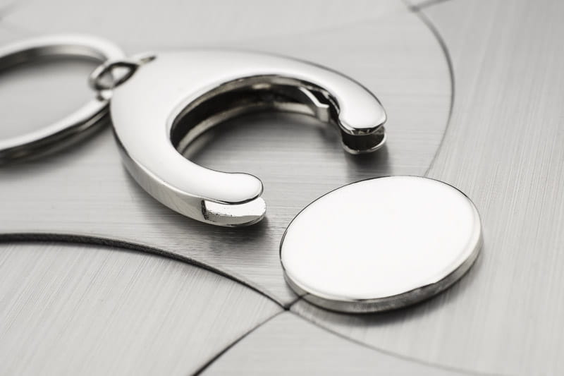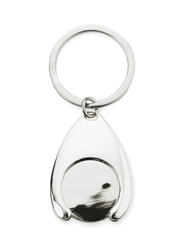 Brelok metalowy na żeton wraz z żetonem, o chromowanej powierzchni. Brelok niezwykle przydatny - przytrzymuje żeton, który pasuje do wózków sklepowych. Pakowany w czarny kartonik. Grawer wykonujemy na żetonie. Żeton jest wielkości 1 Euro.