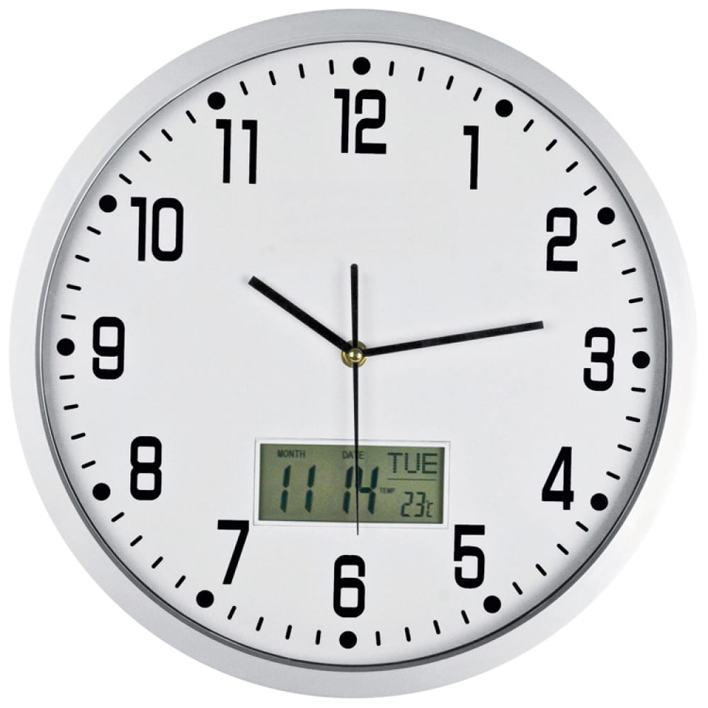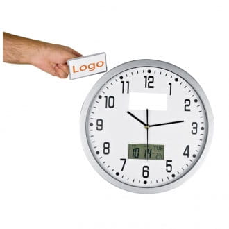 Analogowy zegar ścienny CrisMa z dużym, cyfrowym wyświetlaczem, pokazującym datę, dzień tygodnia oraz temperaturę. Logo nanoszone na specjalnym panelu reklamowym, pod ochronną szybką zegara. Produkt nie zawiera baterii.
