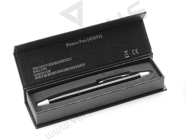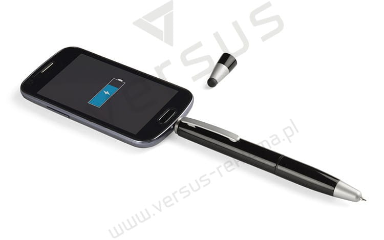 POWER PEN to rewolucja na rynku gadżetów reklamowych. Dzięki zastosowaniu polimerowej baterii umieszczenie power banka o pojemności 700 mAh w długopisie stało się realne. Oprócz power banka posiada również końcówkę touch pen do obsługi ekranów dotykowych oraz długopis z czarnym wkładem. Do ładowania nie potrzebujemy żadnych dodatkowych kabli – po odkręceniu końcówki z touch penem uzyskamy dostęp do wtyczki micro USB służącej do ładowania telefonu, a po wyciągnięciu elementu z długopisem mamy możliwość naładowania power banka za pomocą złącza USB. POWER PEN jest pakowany w eleganckie czarne pudełko. Produkt zaprojektowany specjalnie dla naszych klientów, dostępny wyłącznie w katalogu BLUE COLLECTION.