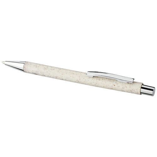 Długopis wciskany Tual ze słomy pszenicy. Elegancki długopis wciskany z korpusem wykonanym ze słomy pszenicznej i wykończony wyrazistymi, chromowanymi detalami. Słoma pszeniczna to część łodygi pozostała po zbiorze ziaren, co zmniejsza ilość używanego tworzywa sztucznego. Włókno słomy pszenicznej, plastik ABS.