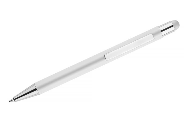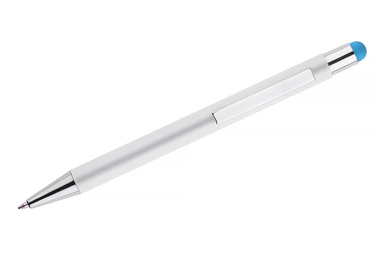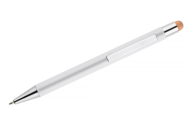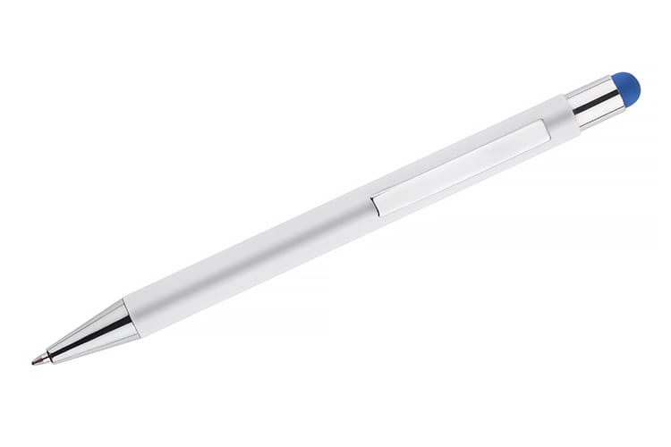 BIANCO to długopis, który zaskakuje efektem znakowania. Wygrawerowane logo jest w kolorze końcówki touch do obsługi ekranów dotykowych. Korpus wykonany z aluminium pokrytego białą farbą. Długopis automatyczny. Wkład typu G2 w kolorze niebieskim.