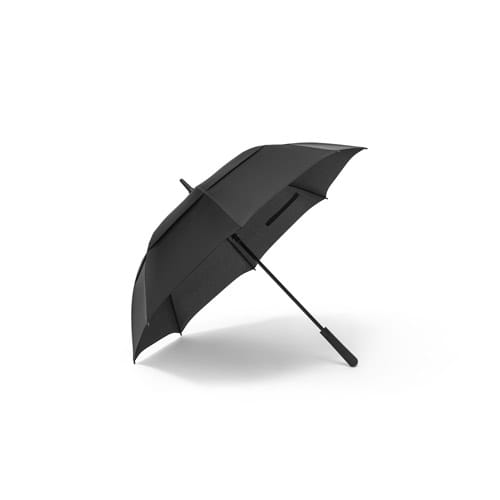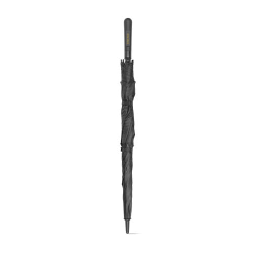 27,5-calowy parasol wykonany z poliestru pochodzącego (100% rPET) 190T pongee. Żebra i trzon z włókna szklanego oraz uchwyt z ABS pochodzącego z recyklingu (35% z recyklingu). Automatycznie otwierany parasol jest również wiatroodporny. Dostarczany w torbie. ø1224 x 940 mm | Etui: ø83 x 763 mm