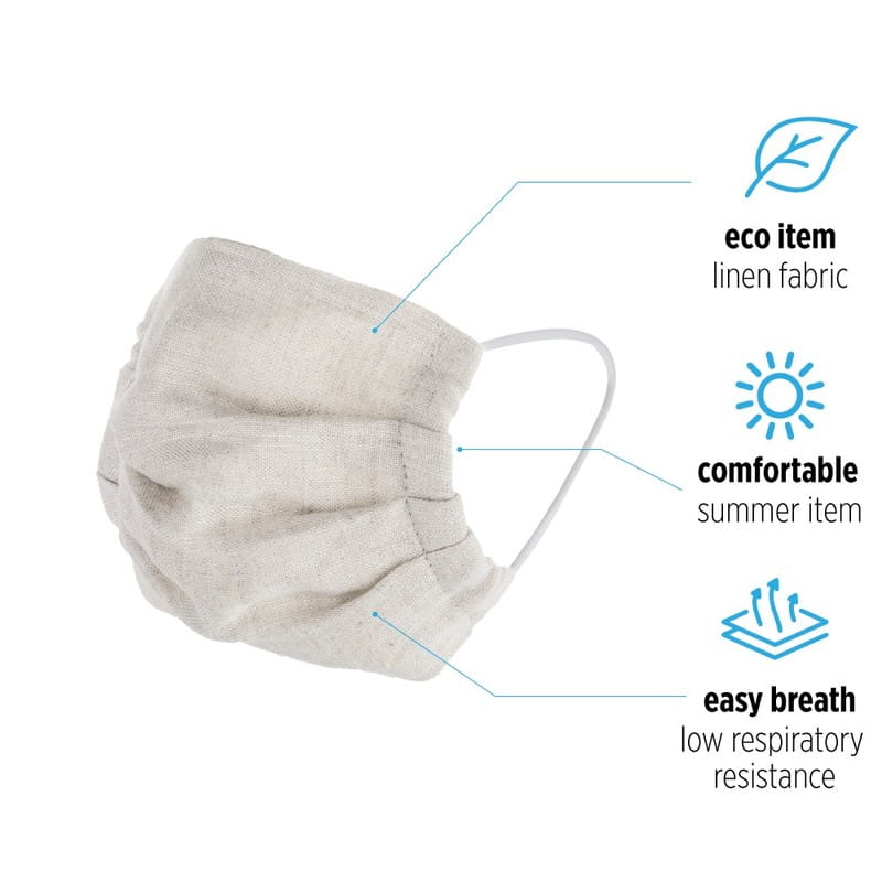 Maseczka ochronna niemedyczna, wielokrotnego użytku, rozmiar dziecięcy, dwuwarstwowa, wykonana z lnu, temperatura pierwszego prania: 30 stopni Celsjusza, temperatura kolejnych prań: 40 stopni Celsjusza, maseczkę można poddawać sterylizacji wodnej w temperaturze 100 stopni Celsjusza oraz prasować w temperaturze do 200 stopni Celsjusza, posiada certyfikat OEKO-TEX Standard 100, elastyczne mocowania zapewniające komfort noszenia, wyprodukowana w Polsce.