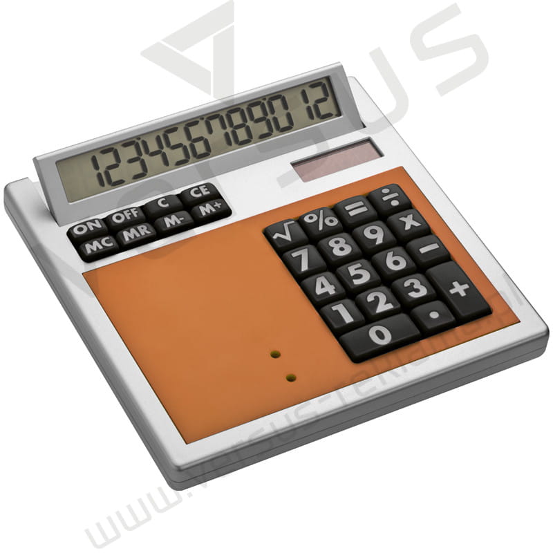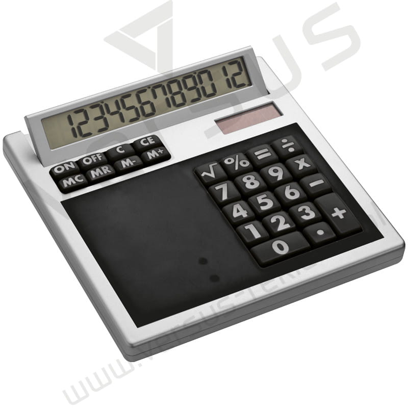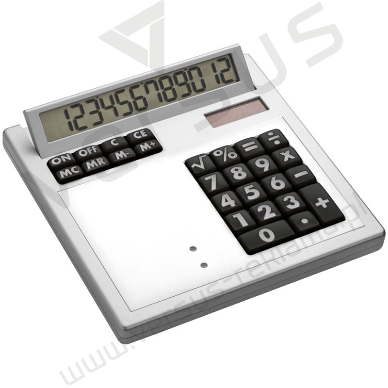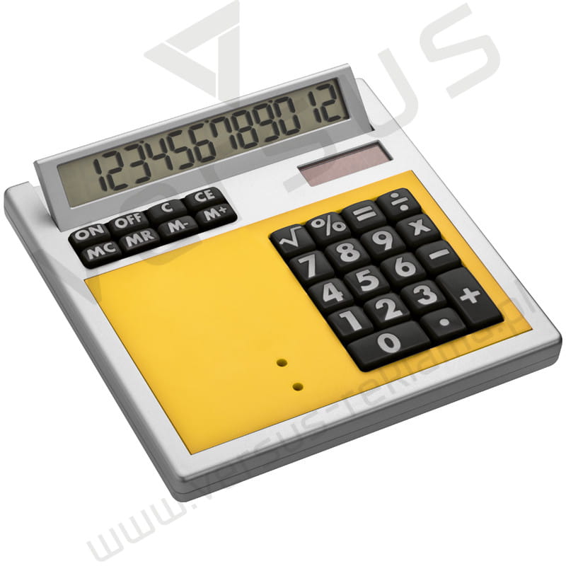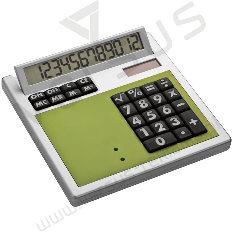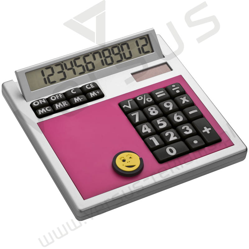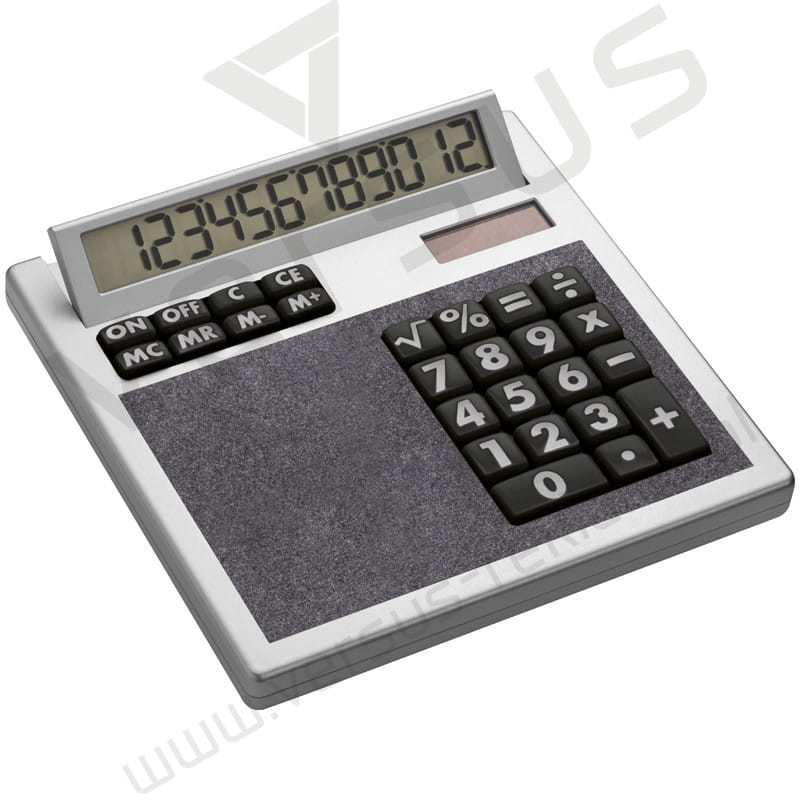 Oryginalny kalkulator z kolekcji CrisMa wykonany z szarego plastiku z kolorową nakładką, która w całości nadaje się pod nadruk i 12 cyfrowym wyświetlaczem. Oprócz tego kalkulator można urozmaicić zabawnym dodatkiem np. buźką lub łapką. zasilania solarne i na baterie.