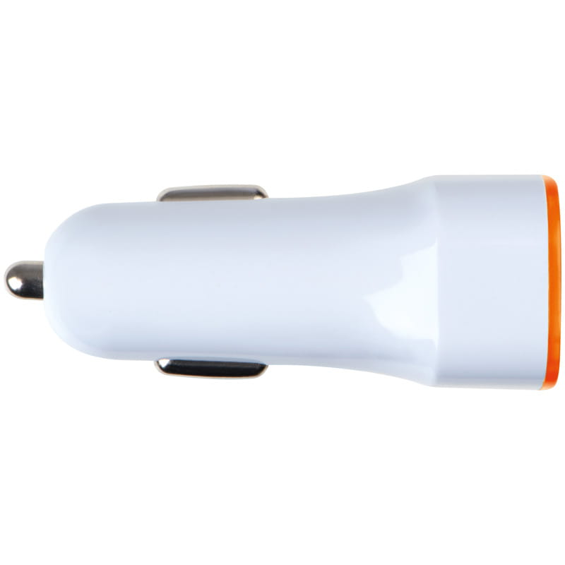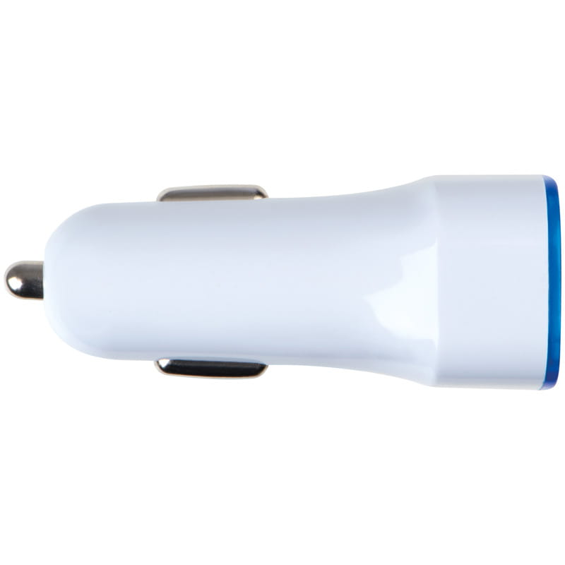 Ładowarka z dwoma wejściami USB podłączana do zapalniczki samochodowej. Po podłączeniu ładowarki kolorowe elementy ozdobne zostaną podświetlone. Logotyp można umieścić bezpośrednio na produkcie.