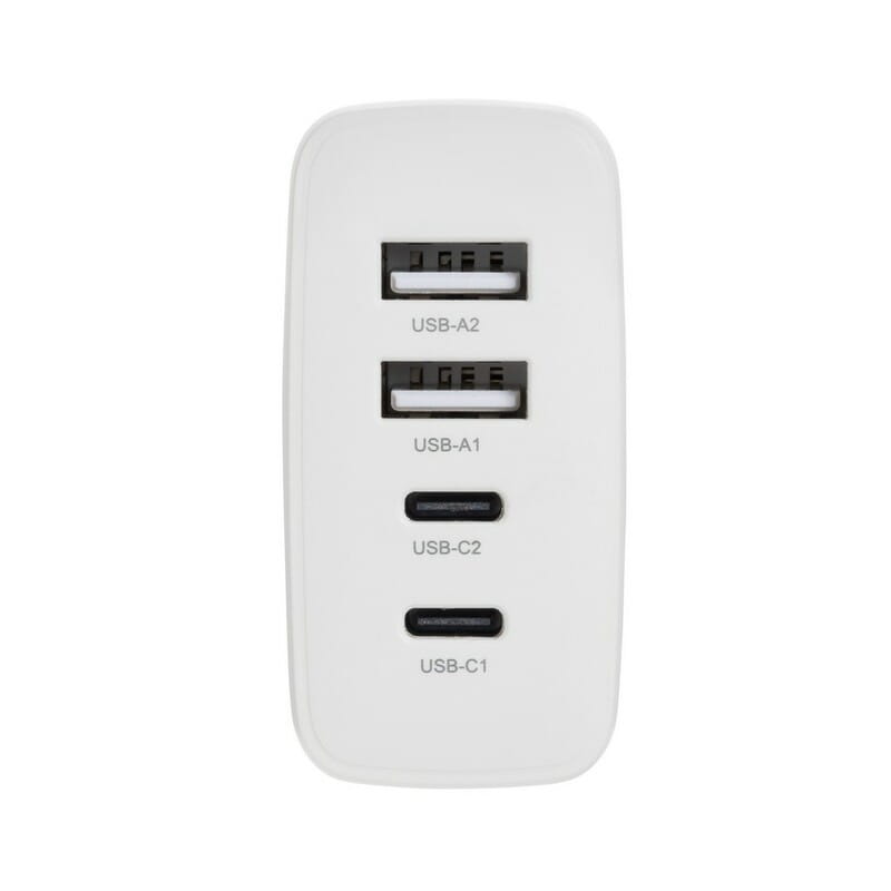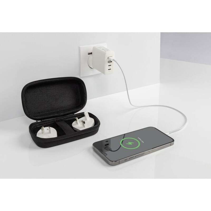 Ładowarka ścienna, adapter podróżny, wykonana z PC z recyklingu z certyfikatem RCS, wtyczki z USA, Australii, UK i UE, wejście 100-240V, 2 wyjścia USB-C, 2 wyjścia USB, moc do 15W, podróżne etui w komplecie całkowita zawartość materiałów z recyklingu obliczona w oparciu o wagę całkowitą przedmiotu: 17%