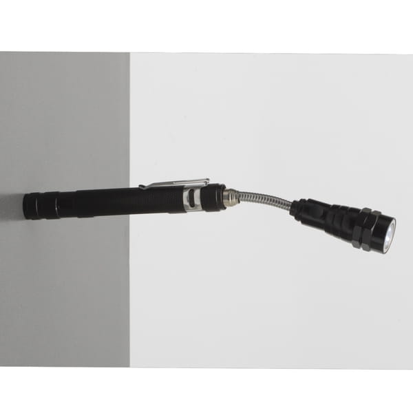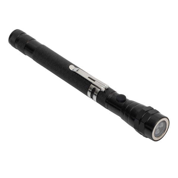 Metalowa wysuwana latarka. Teleskop o długości 38,5 cm. Wyposażona w 3 białe diody LED, o sumarycznym strumieniu światła 30 lumenów. Zaopatrzona w klips oraz magnesy na obu końcach. Zasilana 4 bateriami typu AG13.