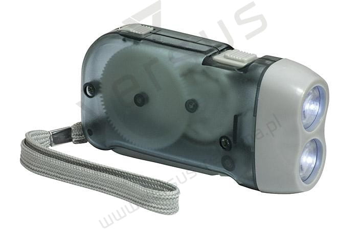 Latarka dynamo z dwoma diodami LED, przyjazna środowisku, nie wymaga baterii, ładowana jest ręcznie. Wykonana z tworzywa, posiada pasek na rękę. Logo nadrukujemy na latarkę metodą tampodruku.