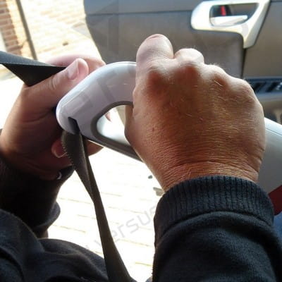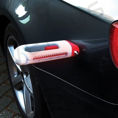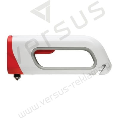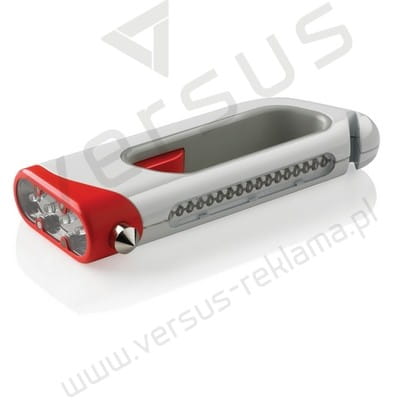 Latarka bezpieczeństwa jest narzędziem niezastąpionym podczas awarii samochodu lub wypadku, zaopatrzonym w światło ostrzegawcze, młotek oraz przecinacz do pasów bezpieczeństwa. Wzór zastrzeżony ®