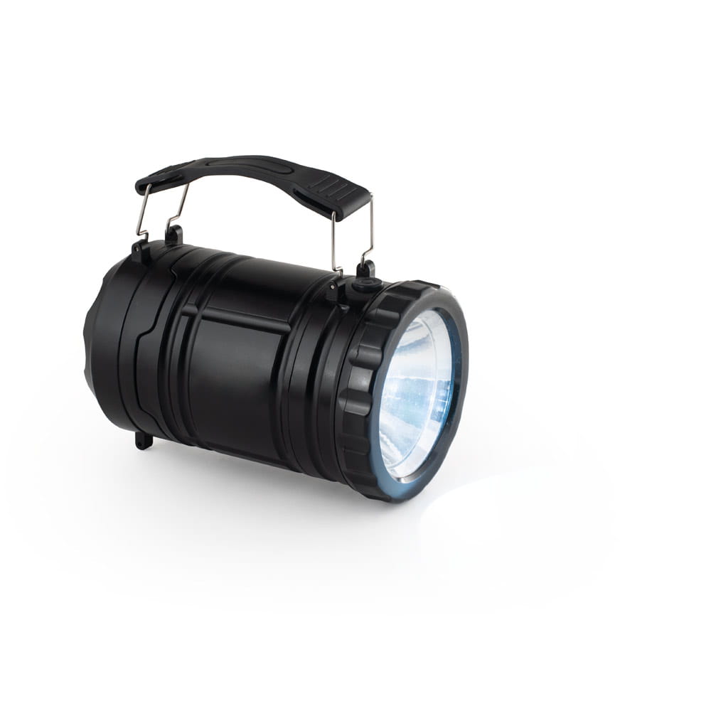 Latarka 2 w 1 wykonana z ABS i PS. 2 tryby użytkowania: lampa zewnętrzna lub kempingowa, która pozwala oświetlić duże obszary lub jako latarnia za pomocą bocznego uchwytu, który jest również zdejmowany. Latarka posiada diodę COB (200 lumenów) i diodę LED o mocy 1 W. Idealna na kemping lub do aktywności na świeżym powietrzu. Zawiera 3 baterie AA. Dostarczany w pudełku. 87 x 140 mm