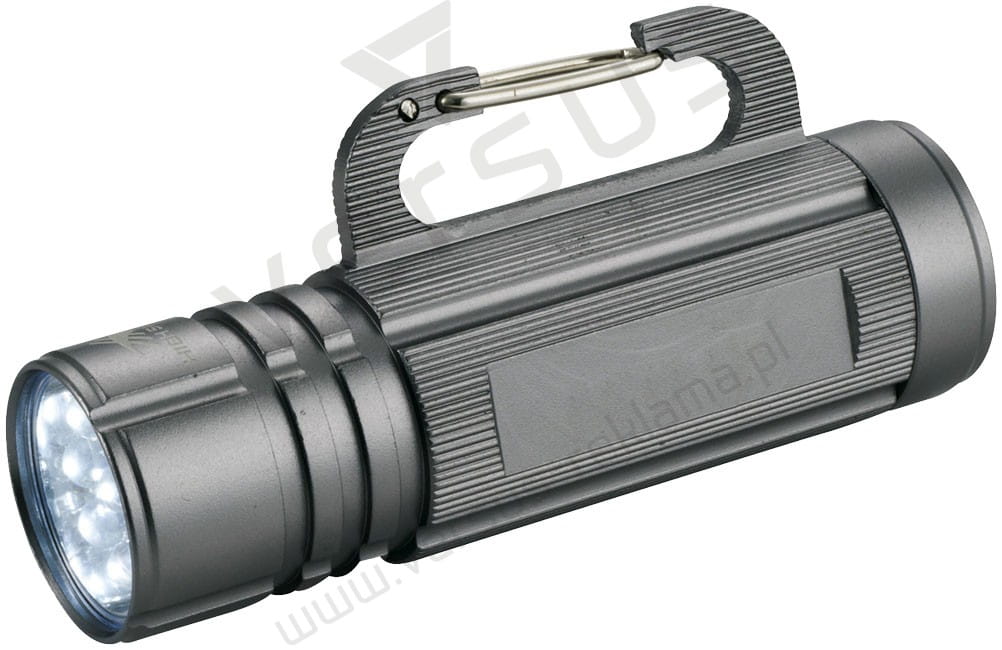 Latarka z karabińczykiem. To doskonała towarzyszka podróży - obojętnie, dokąd się Państwo udają. Można ją łatwo spakować do samochodu, torby czy zabrać na wycieczkę na łono natury. 9 diodek LED, przycisk on/off, 3 baterie AAA. Metal.