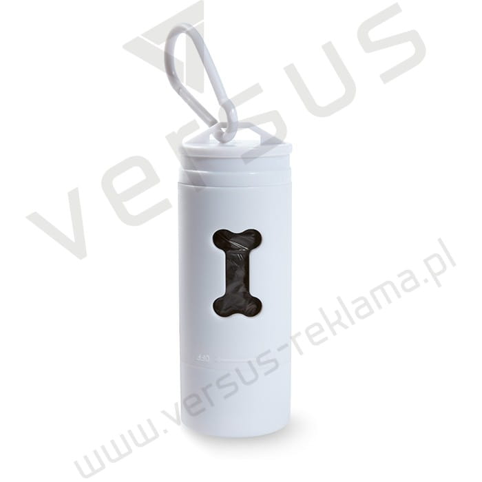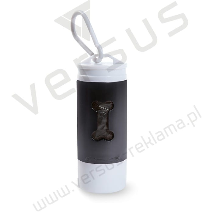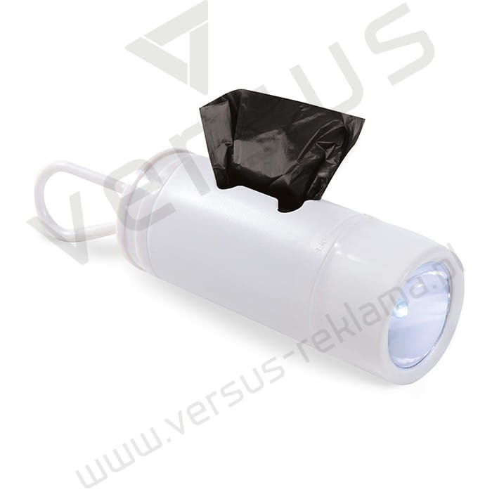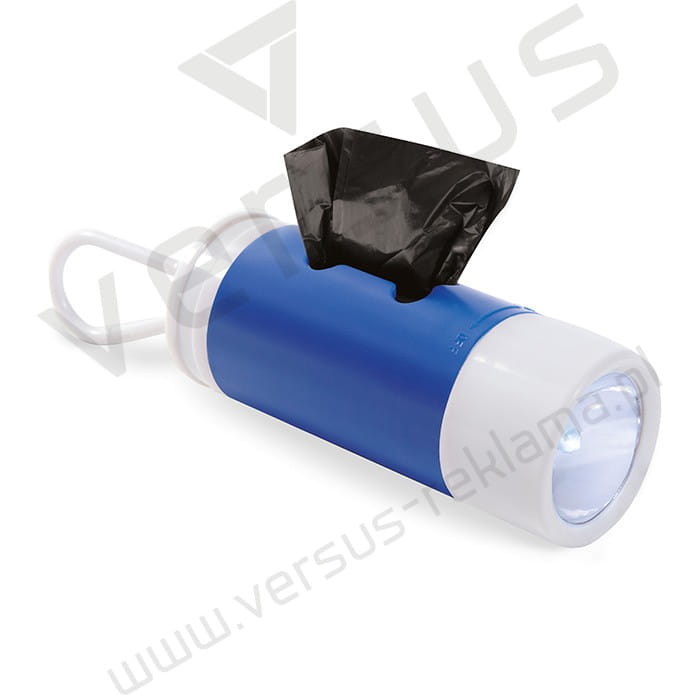 Latarka LED wykonana z ABS, z karabinkiem. Dołączonych 10 woreczków foliowych, aby posprzątać po swoim psie podczas spaceru. 3 baterie LR1130 dołączone.