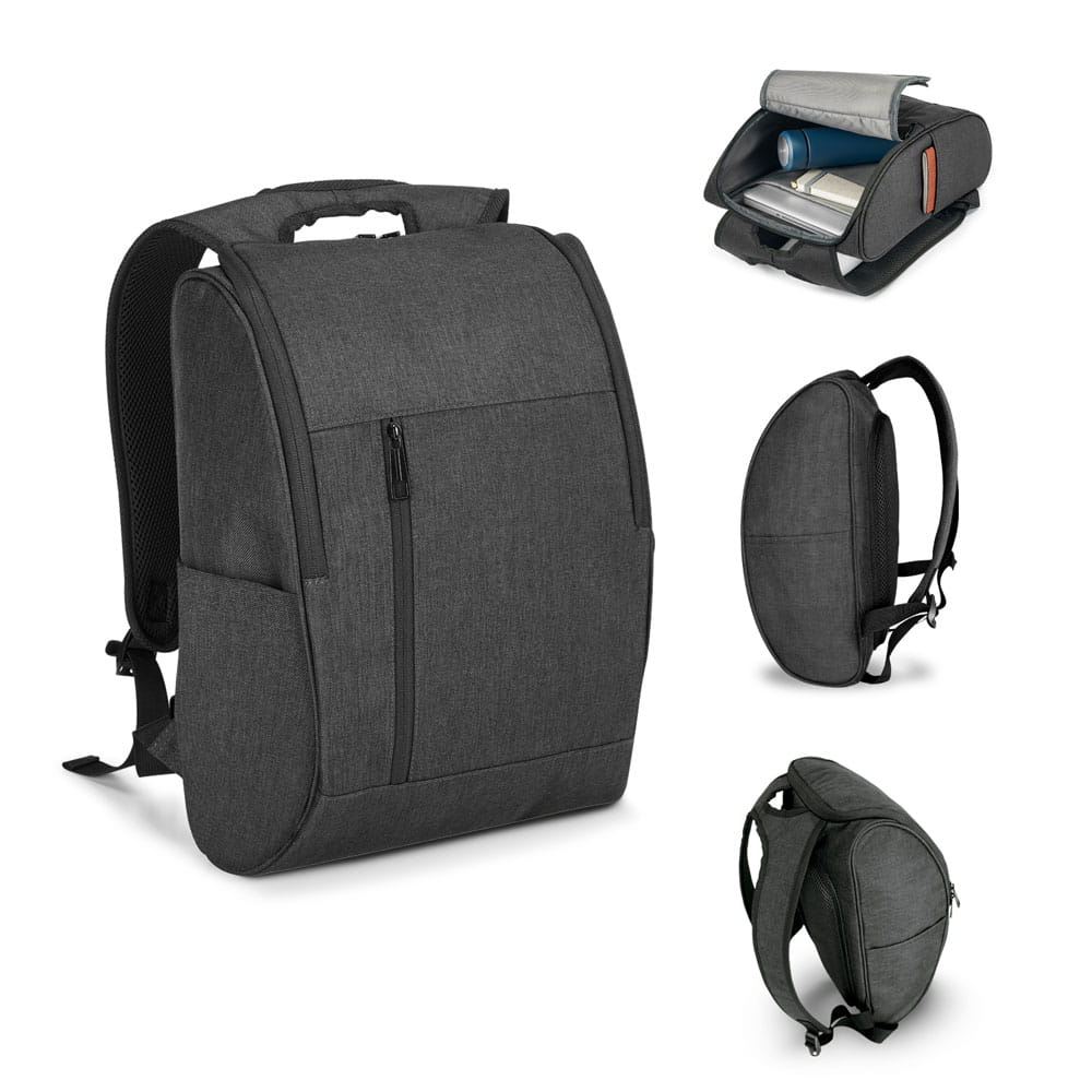 Plecak na laptop. Wysoka gęstość 600D. Komora z 2 miękkimi przegrodami na laptop o przekątnej do 15.6'' i tablet 9.7''. Miękkie wyściełane wnętrze. Przednia kieszeń i 2 boczne kieszenie. Wyściełany tył, miękkie plecy i szelki. 290 x 390 x 155 mm