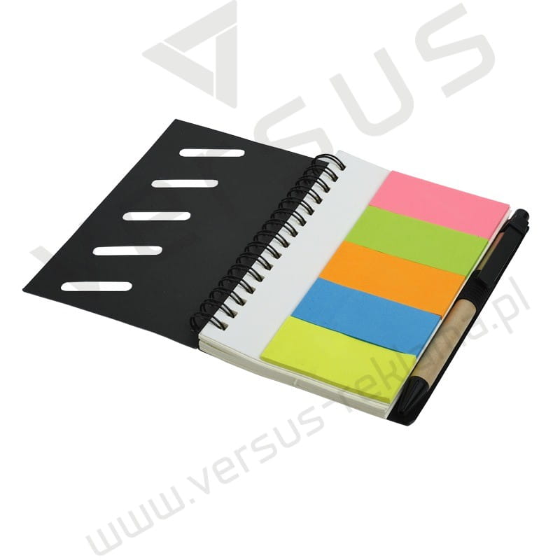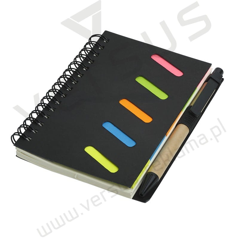 Notes spiralny z długopisem wykonany z papieru oraz kartonu. Notes zawiera 70 kartek o gramaturze 70 g/m² oraz 5 kompletów karteczek samoprzylepnych (w każdym 25 szt. karteczek o gramaturze 73 g/m²). Wkład w kolorze niebieskim