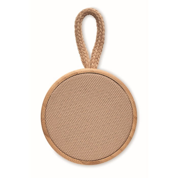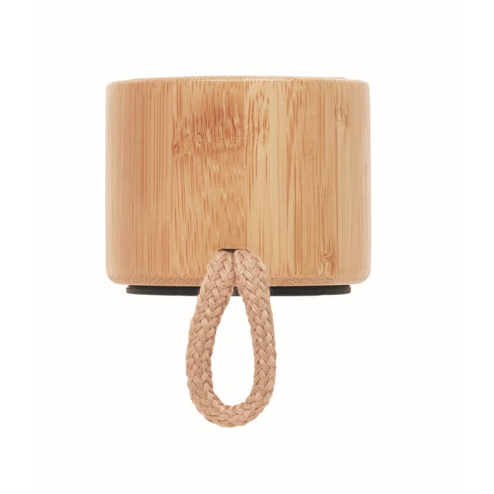Głośnik bezprzew. 5.1 z ABS, bambusowa obudowa, bawełna, pętelką do zawieszenia. Lampka LED, 1 Akumulator Li-POL 300 mAh, port kart SD, kabel AUX/USB. Wyjście: 3W, 3Ohm i 5V. Czas odtwarzania ok. 3h.