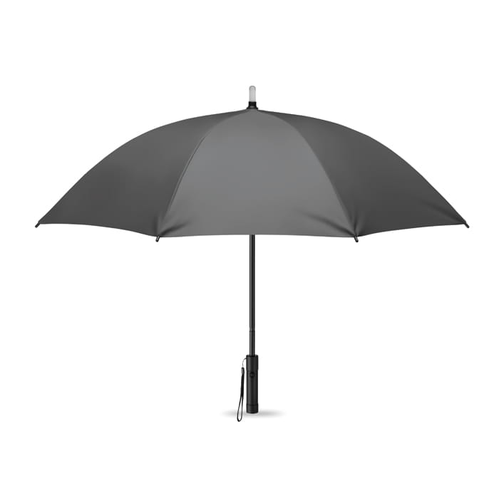23-calowy parasol otwierany manualnie, pongee 190T, z aluminiowym trzonem i żebrami z włókna szklanego z czarnymi końcówkami. Zamykany manualnie. Na górze znajduje się dioda LED (2 tryby świecenia) oraz w uchwycie wbudowana jest latarka. 3 baterie AAA nie są dołączone.