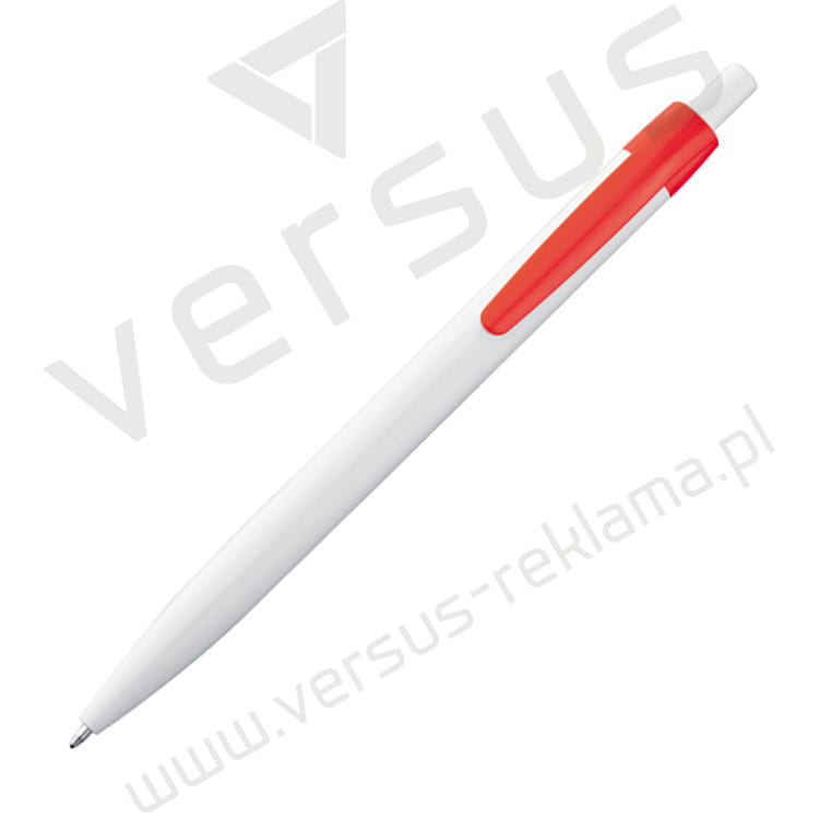 Plastikowy długopis o klasycznym, opływowym kształcie i niebieskim wkładzie. Dzięki białemu korpusowi kolorowy klip sprawia, że długopis rzuca się w oczy.