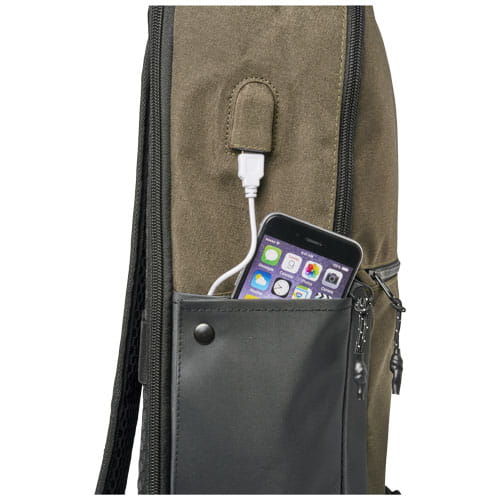 Plecak na laptopa 17" Datson. Plecak na laptopa przeznaczony do codziennego użytku. Zawiera pokrowiec na laptopa 17" w głównej komorze, łatwo dostępną, zapinaną na zamek kieszeń na przedniej klapie i przednią zapinaną na suwak kieszeń z kieszonką organizacyjną. Plecak ten cechują takie udoskonalenia jak wysokiej jakości drukowany materiał, drukowana okładzina wewnętrzna, winylowa zakładka i wymienne zamki błyskawiczne. Dodatkowe cechy jak kieszeń na butelkę oraz silikonowy uchwyt na dole sprawiają, że jest to absolutny must have. 600D Polycanvas.