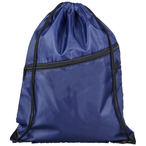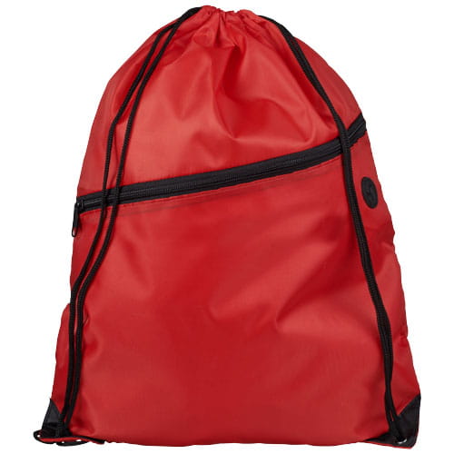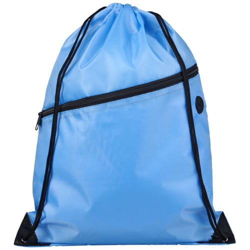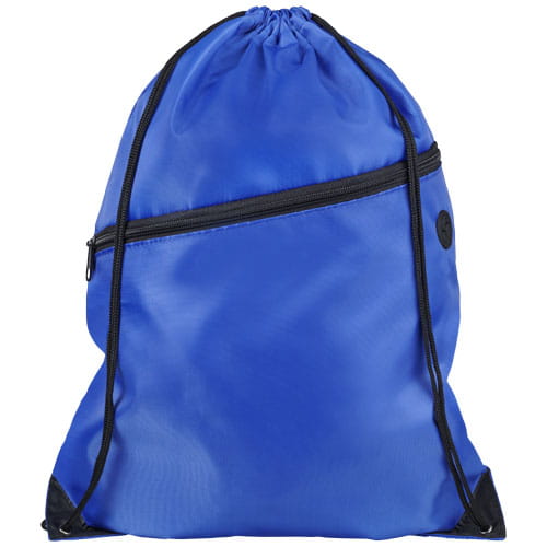 Plecak Oriole z zamkiem błyskawicznym i sznurkiem ściągającym. Duża komora główna z zamknięciem na sznurek w kolorze czarnym. Posiada przednią kieszeń zapinaną na zamek błyskawiczny, kanał na wyprowadzenie słuchawek i wzmocnione narożniki. Wytrzymałość do 5kg. Poliester 210D.