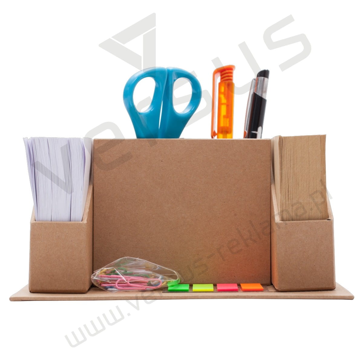 Przybornik biurkowy wykonany z kartonu o grubości 2 mm. Zawiera dwa pojemniki na długopisy i przybory biurowe, 270 karteczek o gramaturze 80 g/m2 w kolorze naturalnym, 270 białych karteczek, zestaw 4 x 25 szt. foliowych zakładek indeksujących oraz ok. 20 spinaczy do papieru.