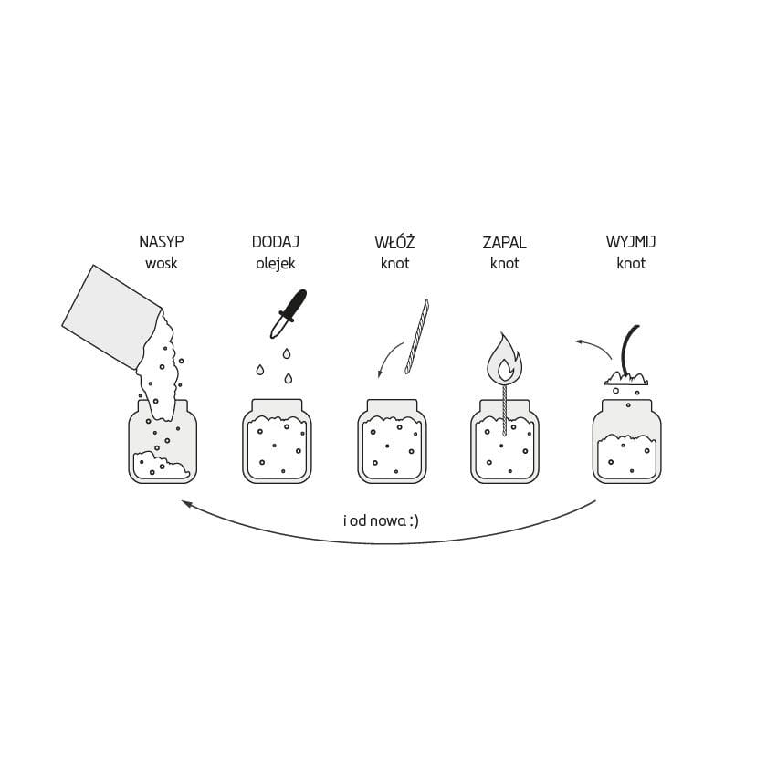 Naturalny, roślinny wosk w formie sypkich perełek. Nasyp go do naczynia, włóż dołączony knot i gotowe! Po zgaszeniu świecy i wyjęciu knota, pozostały wosk zachowuje wszystkie właściwości - można go przesypać lub włożyć nowy knot i zapalić ponownie. Jeden zestaw, wiele możliwości. Wosk perłowy można wsypać do różnych naczyń, zmieniać olejki zapachowe czy rodzaj knotu - za każdym razem świeca jest jak nowa!