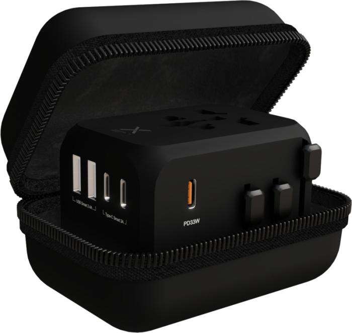 Adapter podróżny z dwoma wyjściami USB-A, dwoma wyjściami typu C i jednym wyjściem ultraszybkiego ładowania typu C z technologią GaN i PD o mocy 33 W. Ten adapter jest kompatybilny w 150 krajach. Dostarczany z etui podróżnym. Politereftalan etylenu (PET), Tworzywo poliuretanowe.