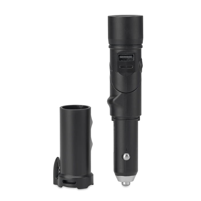 Wielofunkcyjny powerbank 1400 mAh. Zawiera młotek bezpieczeństwa, nóż do pasów, latarkę, migającą lampkę oraz magnes. W zestawie kabel do ładowania USB. Wyjście w samochodzie: DC5V/2A. Wyjście powerbanku: DC5V/1.5A.