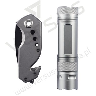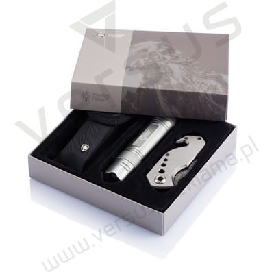Zestaw zawiera latarkę LED 0,5W z otwieraczem do butelek, nóż wielofunkcyjny z młotkiem bezpieczeństwa i nożem do przecinania pasów bezpieczeństwa. W komplecie czarny pokrowiec Swiss Peak. Produkt zastrzeżony ®