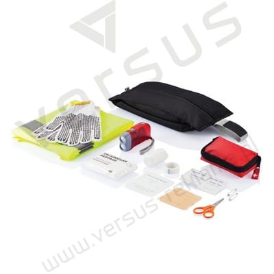 Zestaw z latarką na dynamo, kamizelką odblaskową, rękawicami roboczymi 10 oraz apteczką z zestawem pierwszej pomocy: chusta trójkątna, bandaż PBT, płatki nasączone alkoholem, plastry, nożyczki, szpilki i taśma. Zgodny z normą EN13485:2003.