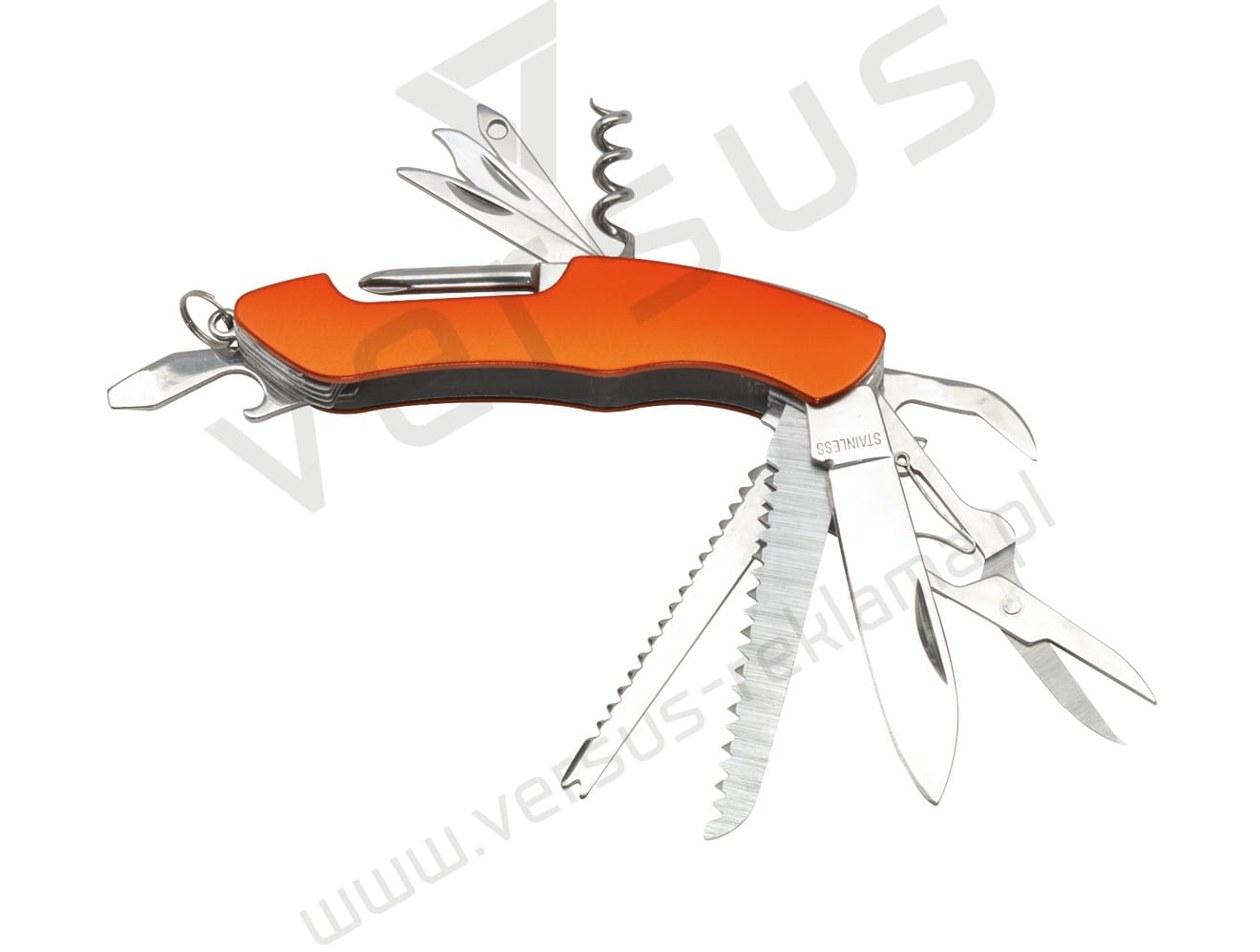 Scyzoryk ALL TOGETHER z 11 funkcjami, nożyczkami, nożem, małą i dużą piłą, otwieraczem do puszek i butelek, korkociągiem, pilniczkiem i śrubokrętem, zapakowane w pudełko.