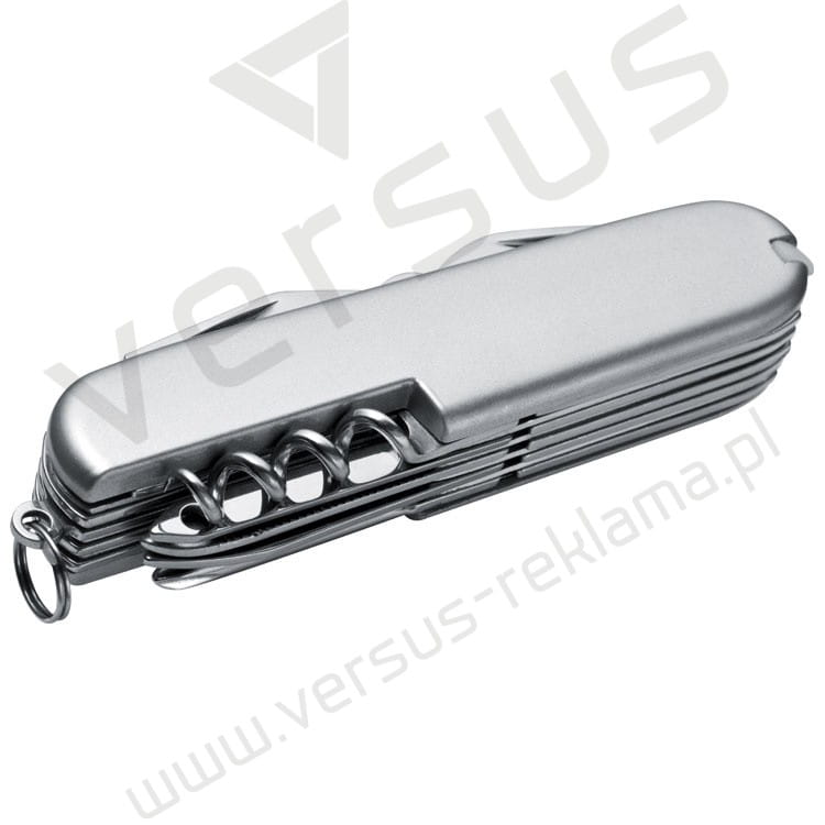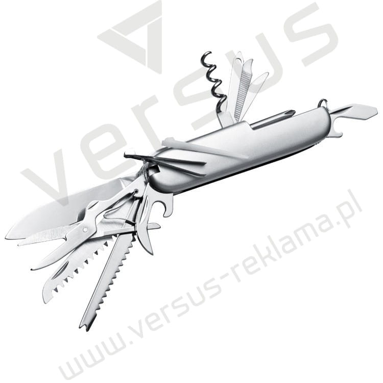 Praktyczny scyzoryk w plastikowej obudowie z 16 funkcjami. Nadruk nanoszony na srebrną obudowę.