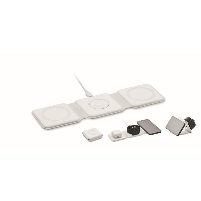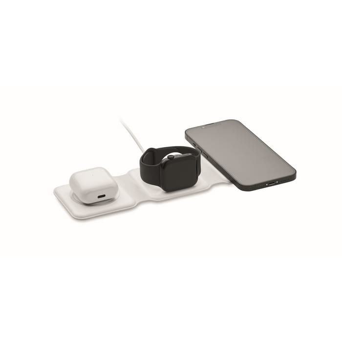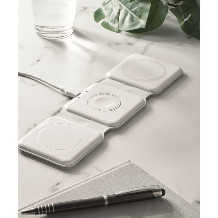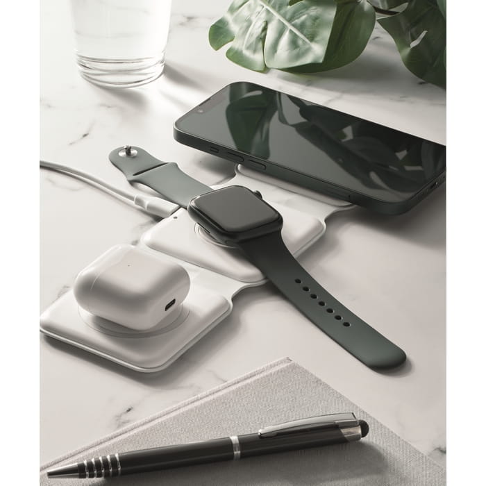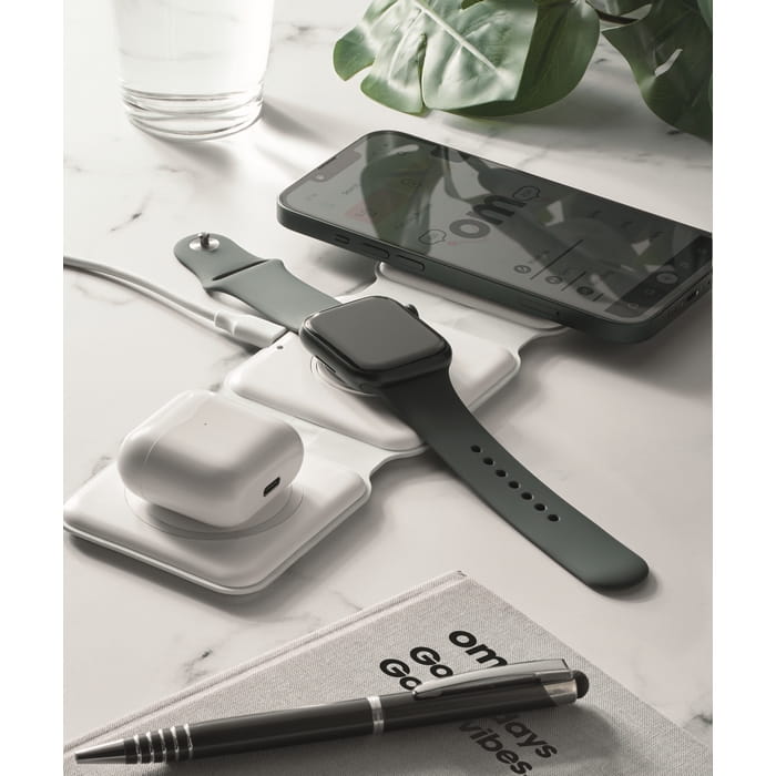 Składana stacja ładująca 3 w 1 z ABS. Posiada 3 punkty ładowania bezprzewodowego (15W). Wejście: 2 w 1 Type-C i Type-A. Kompatybilny ze wszystkimi urządzeniami obsługującymi QI, takimi jak najnowszy Android, iPhone® 8, X i nowsze. Kompatybilny również z iWatch.