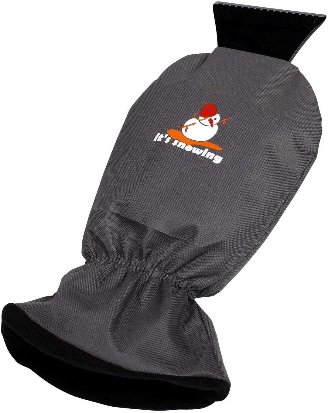Plastikowa skrobaczka do szyb samochodowych z rękawicą zabezpieczającą przed zimnem. Rękawica na zewnątrz została wykonana z wytrzymałego poliestru (600D), a w środku z ciepłego polaru.