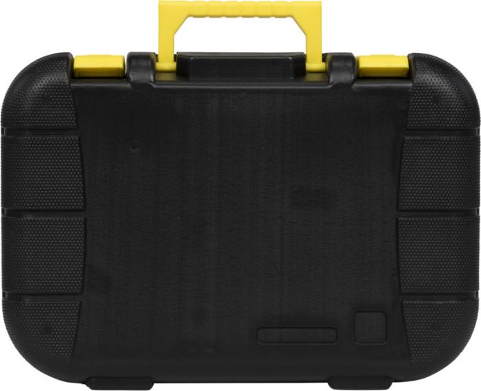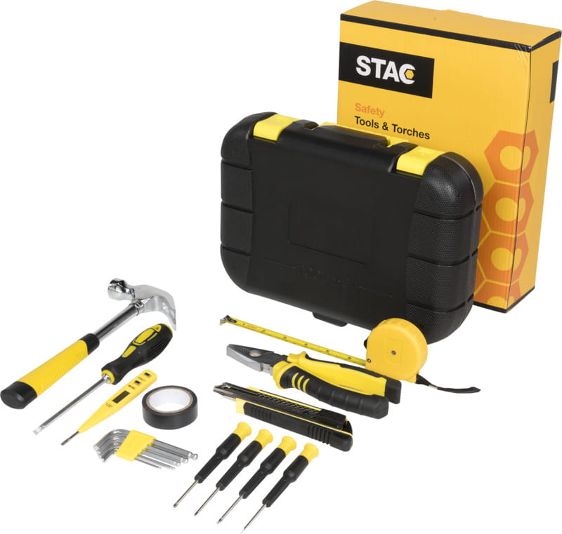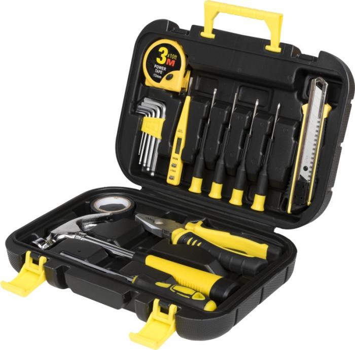 Skrzynka narzędziowa z wysuwanym mechanizmem zamykania zawiera młotek ciesielski, 3,5m taśmę mierniczą, klucz małpę, nóż uniwersalny z funkcją blokowania, poziomicę, 8 kluczy imbusowych (1,5-6 mm) w uchwycie, długie szczypce, przecinak do drutu, śrubokręt z testerem napięcia, 4 wkrętaki precyzyjne (płaskie i Philips) i końcówki do wkrętaka z 10 bitami (PH, PZ, płaski, hex i adapter) w uchwycie. Plastik ABS.