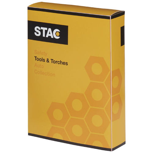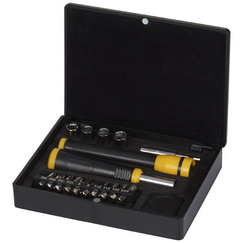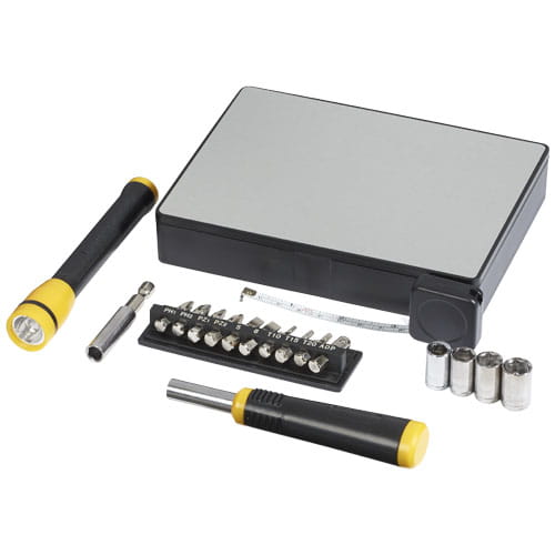 Skrzynka narzędziowa z wkładką EVA i magnesowym zamknięciem pokrywy zawiera pojedynczą białą latarkę LED, 1 m taśmę mierniczą, uchwyt śrubokręta z paskiem magnetycznym, 4 głowice nasadowe (7, 8, 9, 10), uchwyt do wierteł z 9 wiertłami (PH, PZ, płaskie i Torx) i przetwornik klucza nasadowego. Tworzywo ABS i cyna.