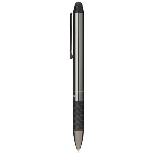 Długopis Stylus. Solidny i smukły, objęty wzorem zastrzeżonym długopis ze stylusem Charakteryzuje się korpusem z wygodnym miejscem na palce. W zestawie wkład premium z czarnym tuszem i pudełko upominkowe „LUXE” (15x3,5x2 cm). Aluminium.