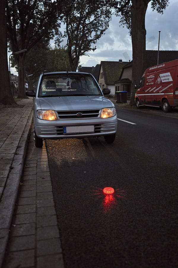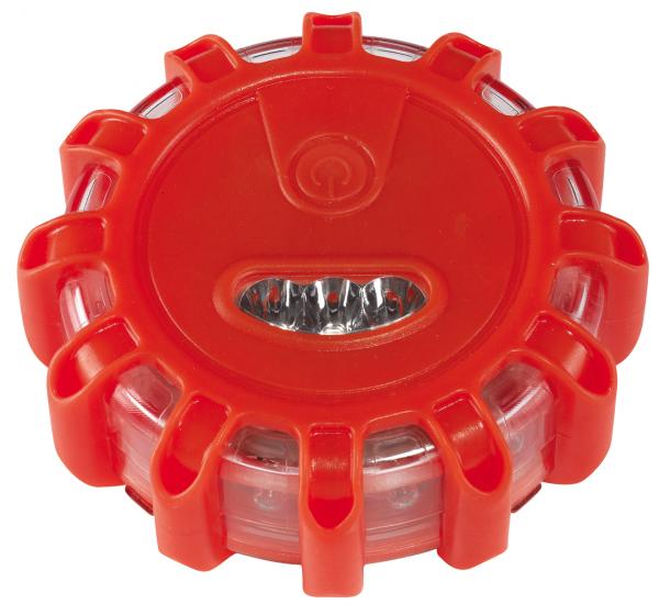Światło ostrzegawcze, wodoodporne, z diodami LED i pięcioma trybami świecenia (światło tylko na gorze, obrotowe, migoczące, migające, stałe), przełącznik on/off, w częściowo gumowanej przezroczystej obudowie z magnesem i składanymi haczykami na dole.