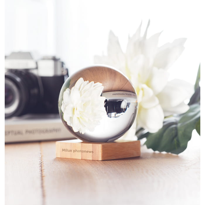 Szklana kula do tworzenia artystycznych efektów fotograficznych, posiada bambusową postawę. Przeznaczona do robienia zdjęć z efektem: do góry nogami, portret, krajobraz i / lub architektura. Bambus jest materiałem naturalnym, jego kolor może się różnić w poszczególnych przypadkach.
