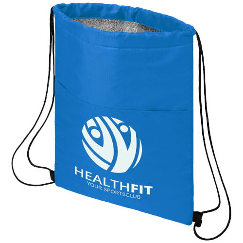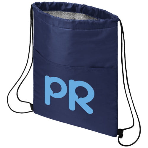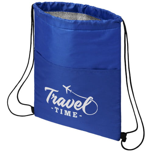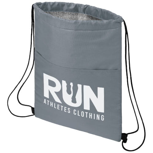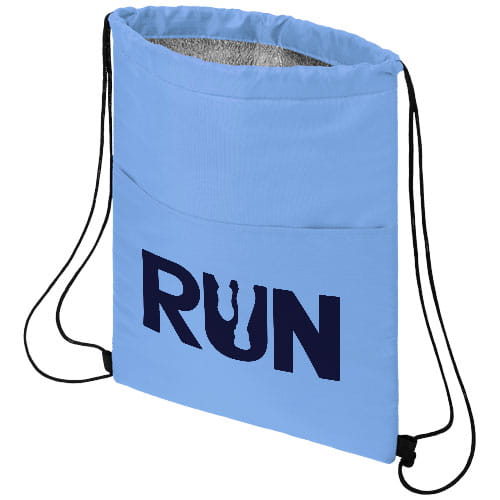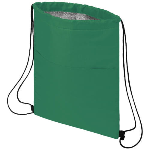 Torba chłodząca z zamknięciem na sznurek w kolorze czarnym. Posiada otwartą przednią kieszeń. Mieści do 12 puszek. Wytrzymałość do 5 kg. 210DPoliester.