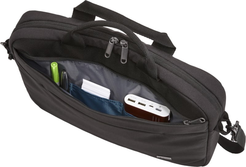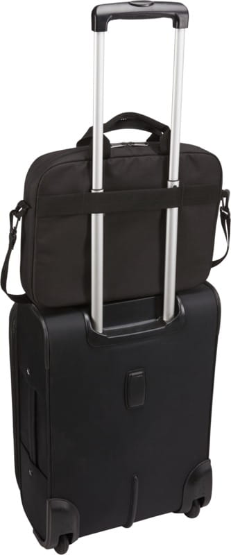 Posiada główną komorę z wyściełaną przegrodą na laptopa 14 cali i kieszeń na tablet 10,1 cala Jest wyposażony w przedni panel organizacyjny do przechowywania długopisów, drobnych urządzeń elektronicznych i kabli. Przednia kieszeń zawiera ukryty zamek błyskawiczny, który zabezpiecza telefon i ułatwia do niego dostęp. Zawiera zdejmowane, wyściełane i regulowane ramiączka, wyściełane górne uchwyty i prowadnice wózka. Gwarancja Case Logic: 25 lat. Poliester.
