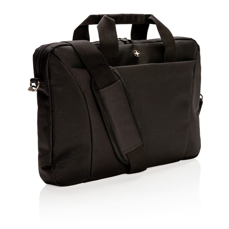 Torba na laptopa 15,4", wykonana z poliestru 600D i 1680D, wewnątrz kieszeń na tablet, z przodu kieszeń na zamek błyskawiczny z miejscem na przybory do pisania i inne akcesoria, regulowany i odpinany pasek na ramię umożliwia noszenie torby na różne sposoby, posiada mocowanie do walizki, nie zawiera PVC