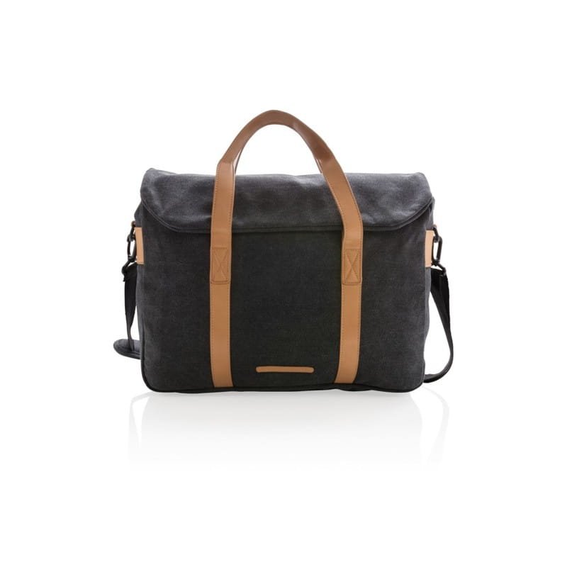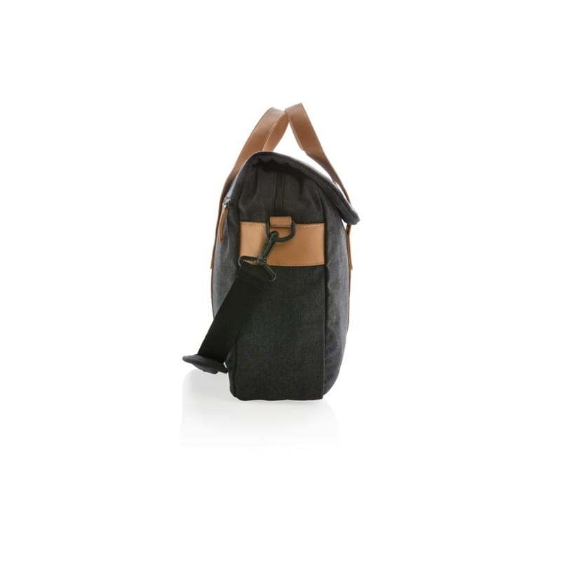 Torba na laptopa 15,6"', wykonana z naturalnego i wytrzymałego płótna oraz imitacji skóry, wewnątrz miejsce na dokumenty, tablet i inne akcesoria, regulowany i odpinany pasek na ramię w komplecie, nie zawiera PVC