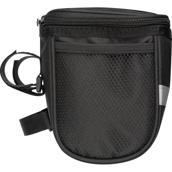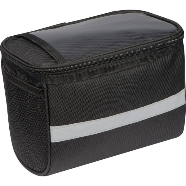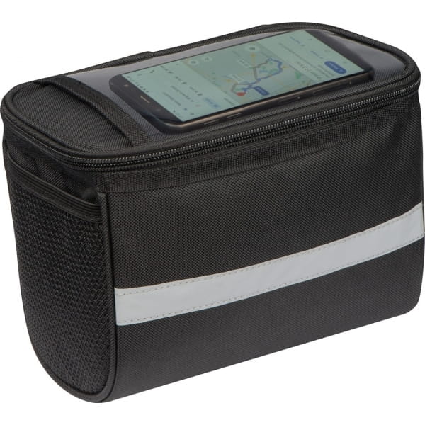Torba na rower, do mocowania na kierownicy. Posiada dużą komorę główną, przegródkę na telefon dotykowy, umożliwiającą korzystanie z niego oraz odblaskowy pasek dzięki któremu będziesz lepiej widoczny na drodze.