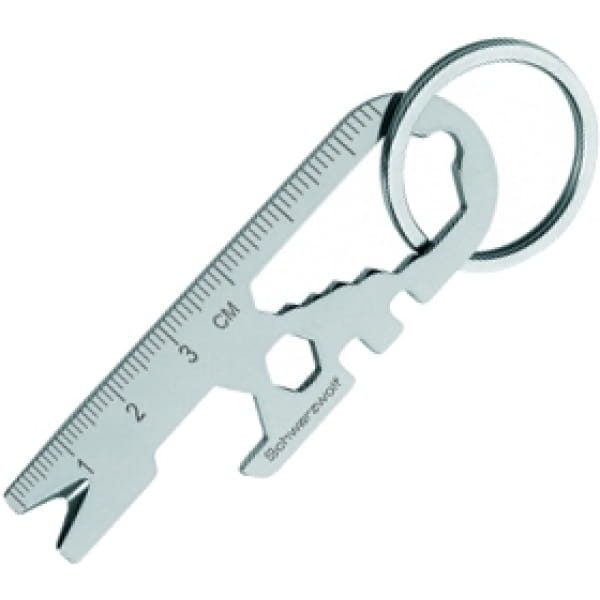 Wielofunkcyjny brelok marki Schwarzwolf zawierający 13 różnych narzędzi, w tym linijkę, magnes, klucz w 6 rozmiarach oraz otwieracz do butelek. Pakowany w oryginalne pudełko Schwarzwolf.