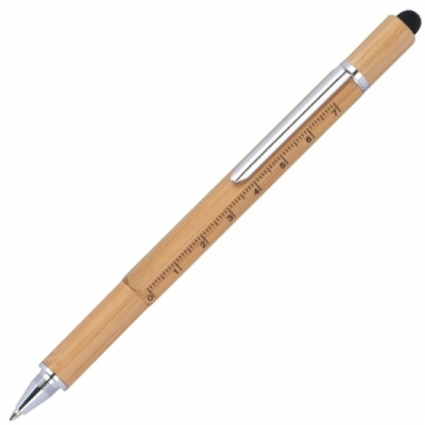 Praktyczny wielofunkcyjny długopis 6w1 wykonany z bambusa z następującymi cechami: przekręcany długopis z czarnym wkładem systemowym, linijka, poziomica, śrubokręt płaski i krzyżakowy oraz pióro dotykowe.