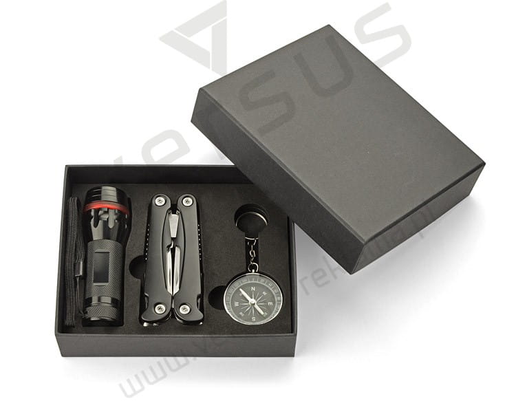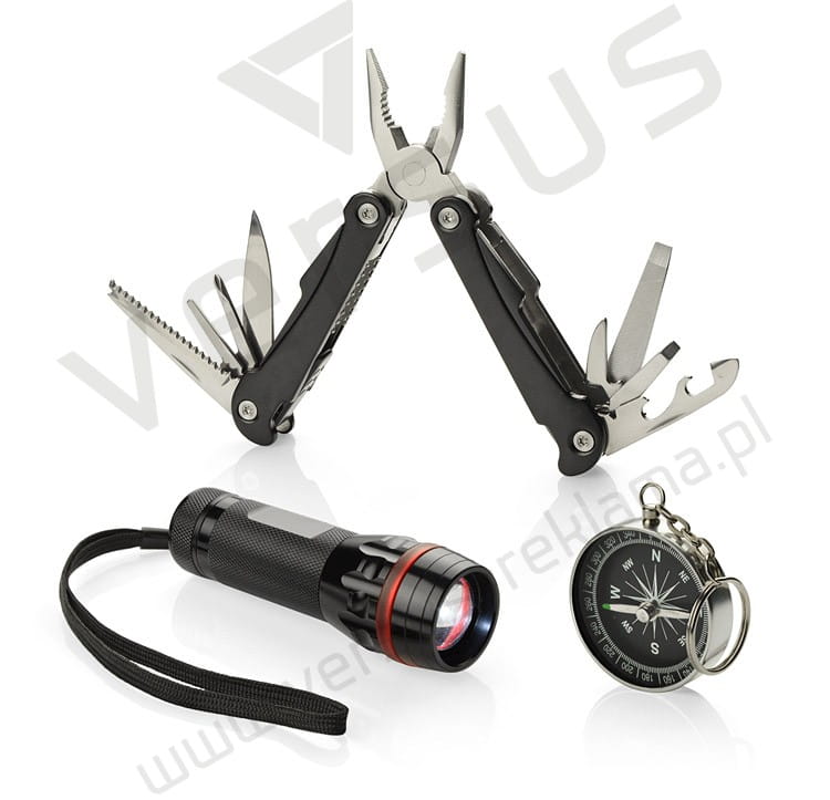 Zestaw upominkowy zawierający latarkę, narzędzie wielofunkcyjne oraz kompas. Latarka posiada bardzo jasną diodę, możliwość regulacji wiązki światła oraz 3 tryby świecenia: mocny, słaby oraz migający. Każdy element jest wykonany z metalu a całość zapakowana w eleganckie czarne pudełko.
